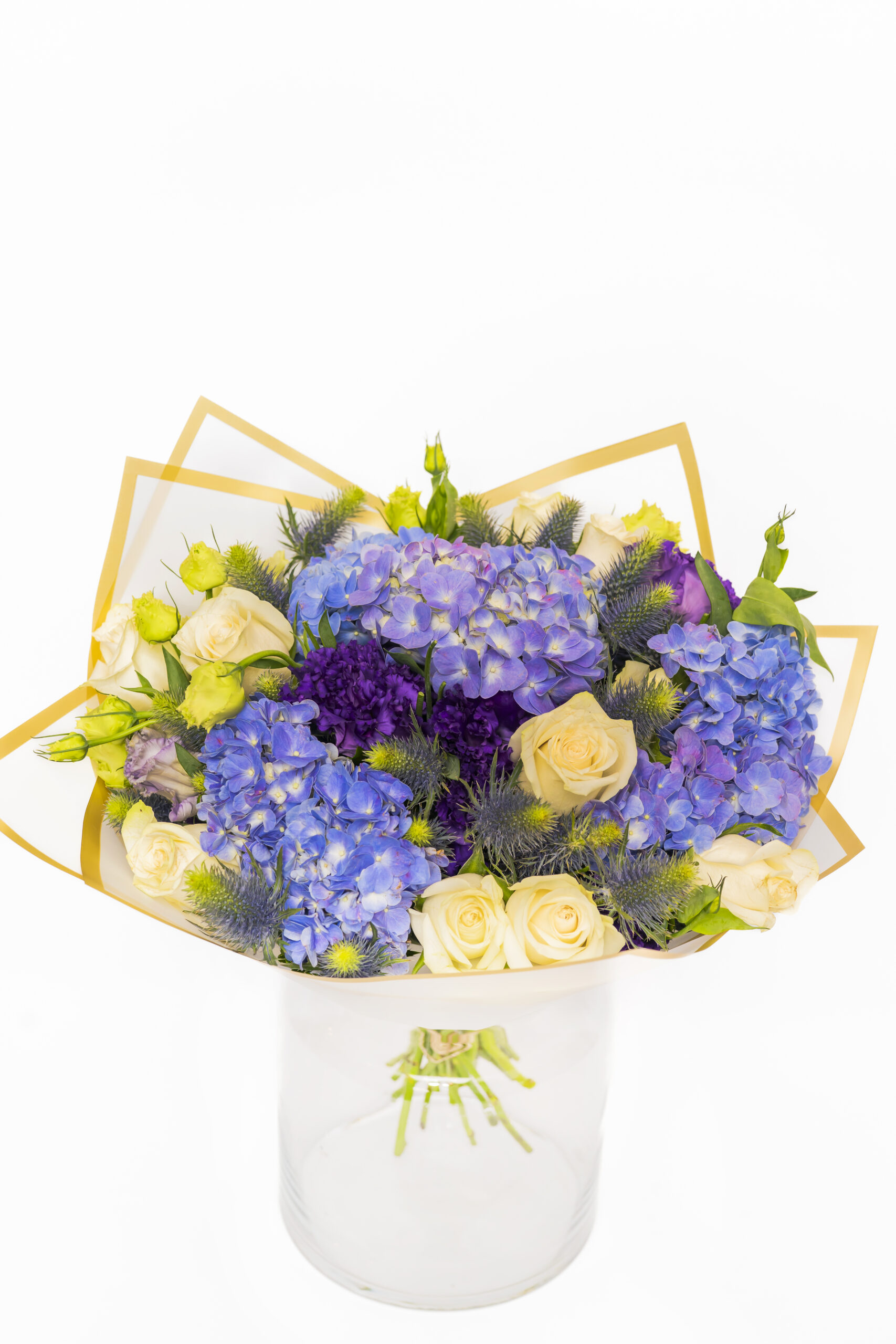 A serene symphony of blue hydrangeas, white roses, and purple statice — this bouquet whispers of elegance and depth. The hydrangeas speak in tones of heartfelt emotion, their dusky blues echoing quiet strength. White roses, pure and timeless, bloom like soft-spoken promises, while sprigs of statice bring a touch of the eternal — memory, devotion, and soul.