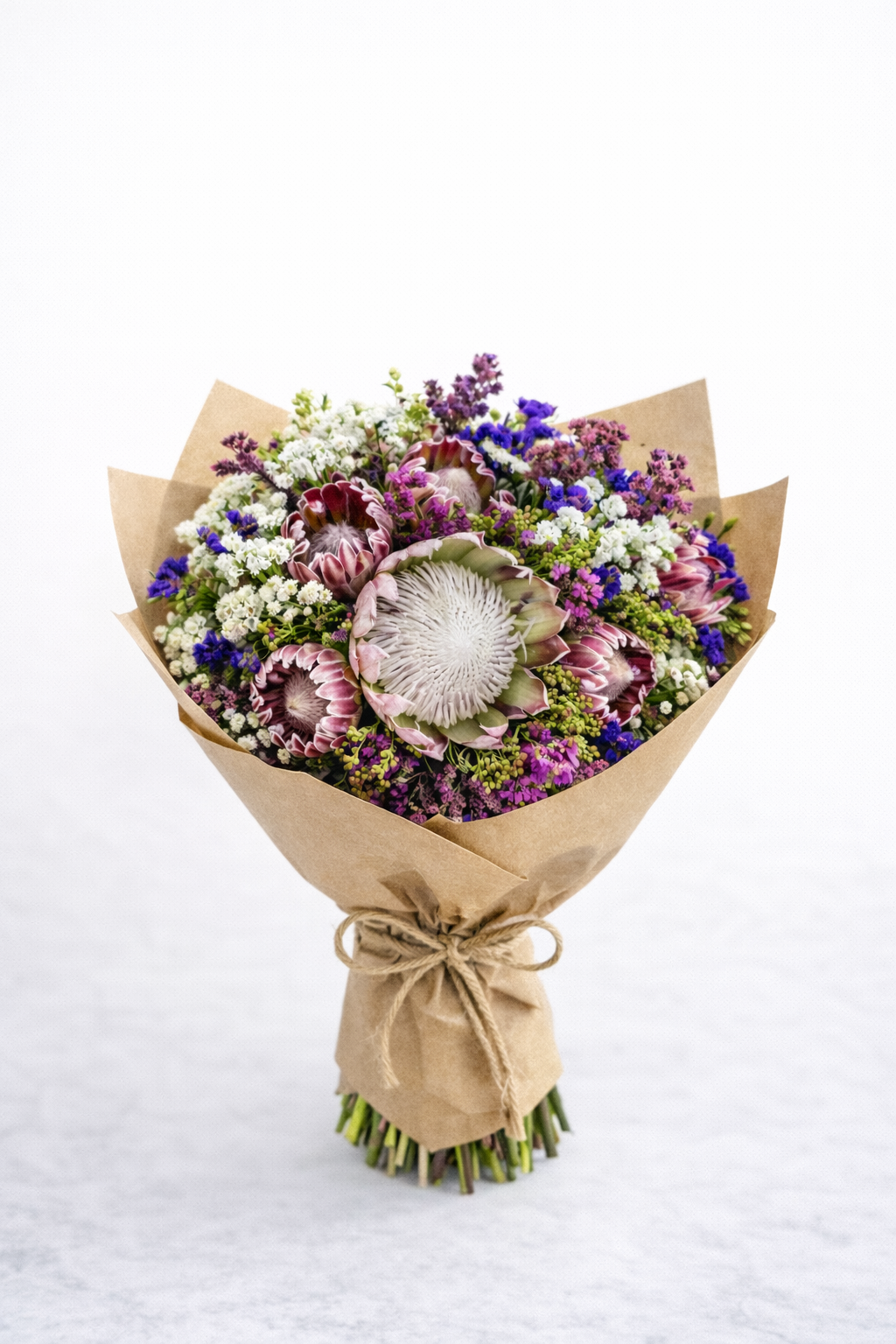 A bold and breathtaking bouquet centered around the striking King Protea, this arrangement is a celebration of natural elegance and wild beauty. Surrounded by delicate sprigs of white statice, purple limonium, and lush green foliage, the proteas shine with their regal pink petals and unique texture. Wrapped in a lotus-inspired golden-edged paper, this bouquet exudes sophistication and charm — perfect for meaningful moments, from grand gestures to elegant decor.
