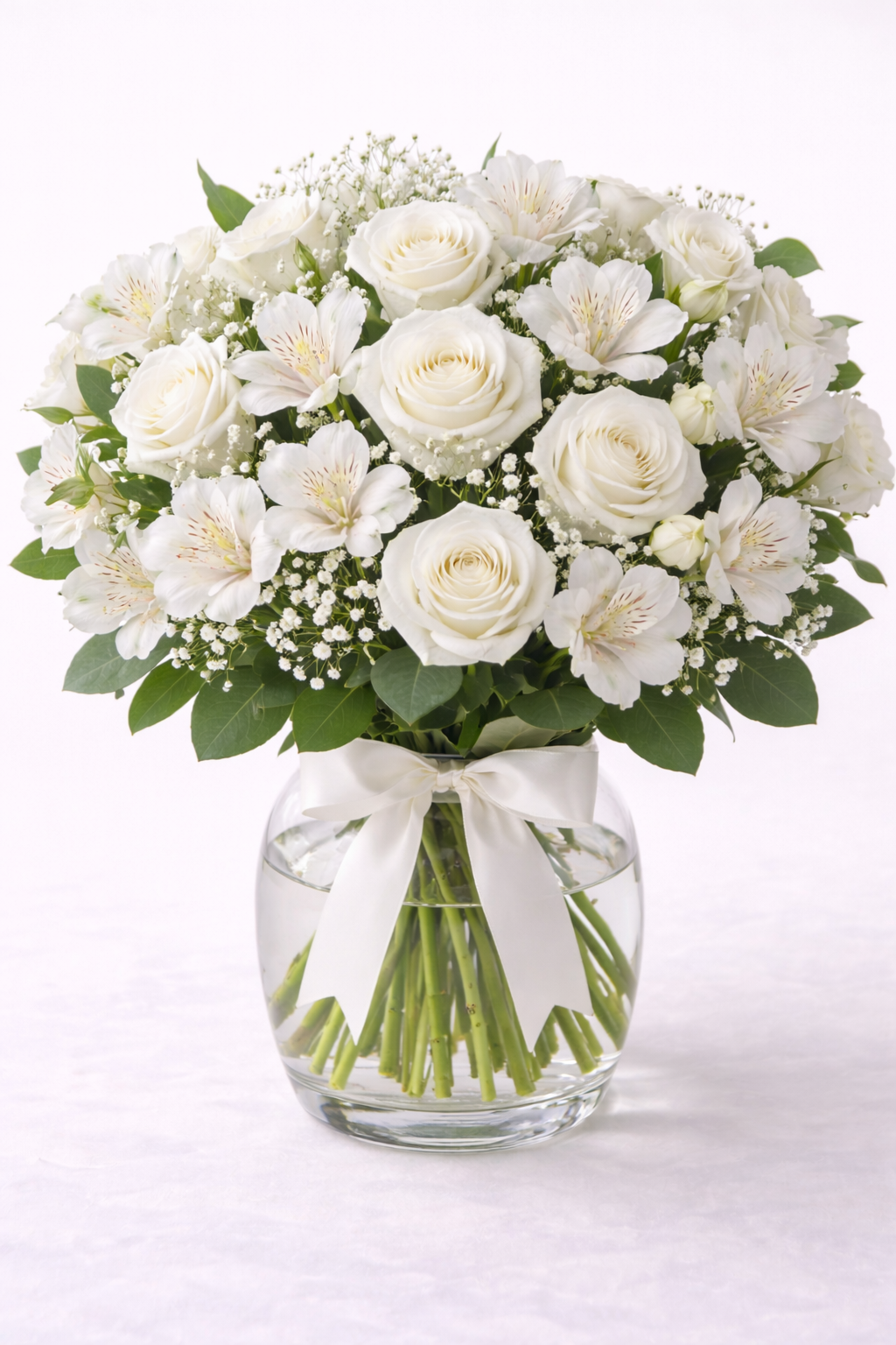 A timeless expression of grace and calm. Ivory Whisper features premium white roses paired with delicate white alstroemeria and soft clouds of baby’s breath, all nestled in lush green foliage. Arranged in a clear glass vase and finished with a satin white ribbon, this bouquet feels fresh, elegant, and effortlessly refined.