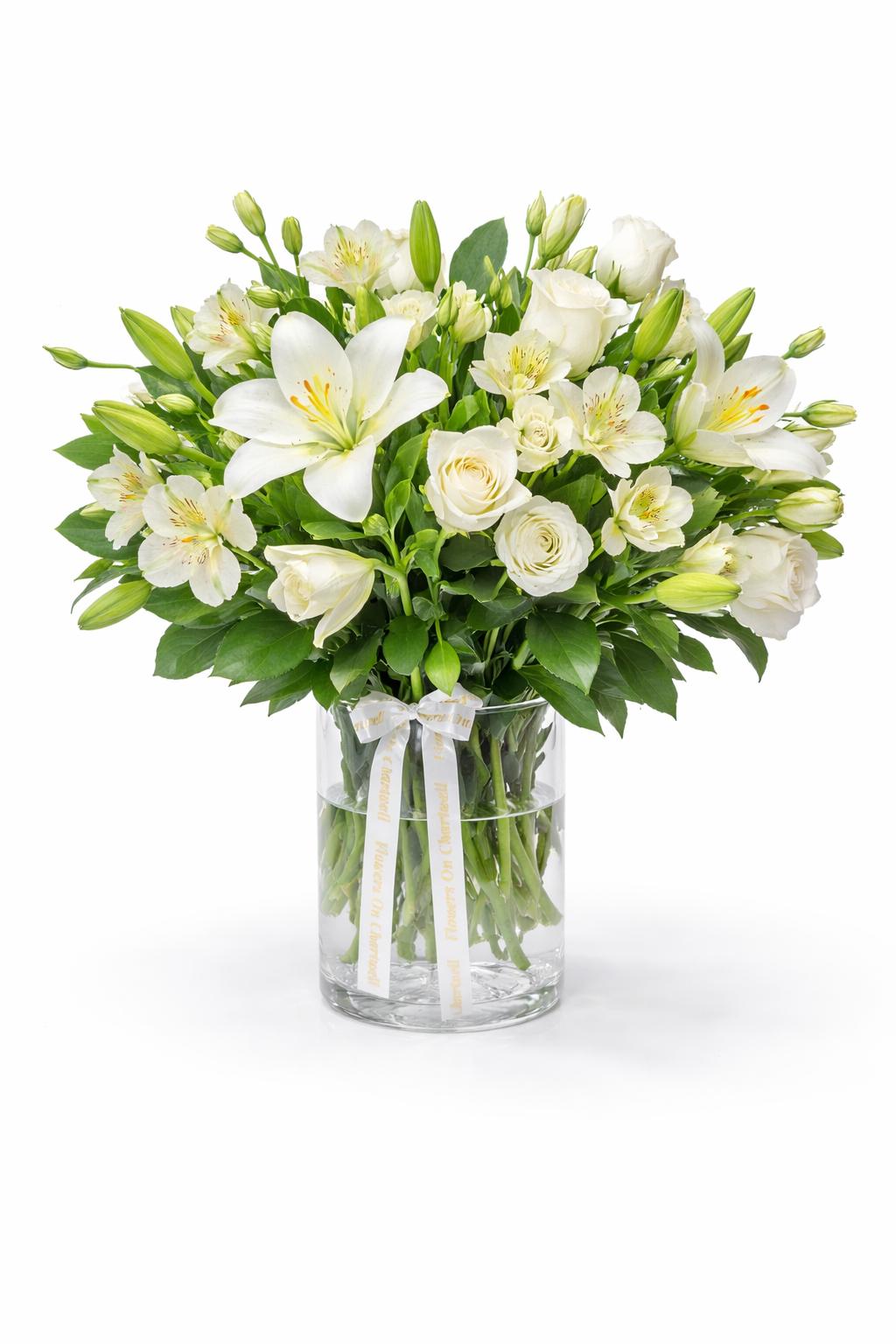 A timeless and graceful arrangement that embodies purity, peace, and understated elegance. Featuring pristine white lilies, soft white roses, and delicate seasonal blooms, this bouquet is beautifully complemented by fresh greenery for a natural, refined finish. Perfect for expressing sympathy, celebrating new beginnings, or adding a touch of calm sophistication to any space, Pure Serenity is both classic and meaningful.