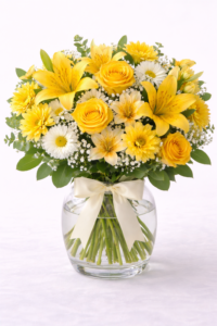 Bright, joyful and full of life, Sunny is a celebration of warmth and positivity. This arrangement features cheerful yellow blooms complemented by soft white accents and fresh greenery, beautifully styled in a clear glass vase with a delicate ribbon finish. Designed to lift spirits and light up any room, Sunny is the perfect gift for celebrations, thank-yous, or simply to make someone smile.